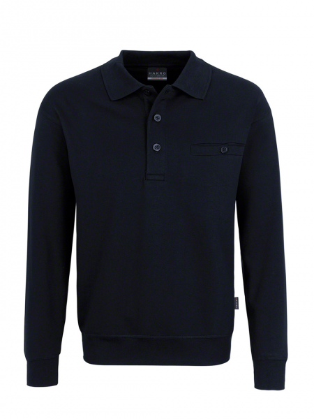 Klassischer Polo-Sweater mit hochwertig verarbeiteter 3-Loch-Knopfleiste mit extra haltbar angenähten, bruchsicheren Knöpfen (Ton-in-Ton), Brusttasche mit Knopfverschluss, Ersatzknopf, formstabilen Bündchen mit LYCRA®-Anteil, nicht angerauter Innenseite (French-Terry) und Nackenband. Hergestellt aus pflegeleichter Baumwoll-Polyester-Mischung für höchste Ansprüche. Gewebtes HAKRO Necklabel aus hochwertigem Kettsatin mit weichen, ultraschallgeschnittenen Bandkanten für höchsten Tragekomfort und gewebtes HAKRO Flaglabel an der linken Seitennaht.