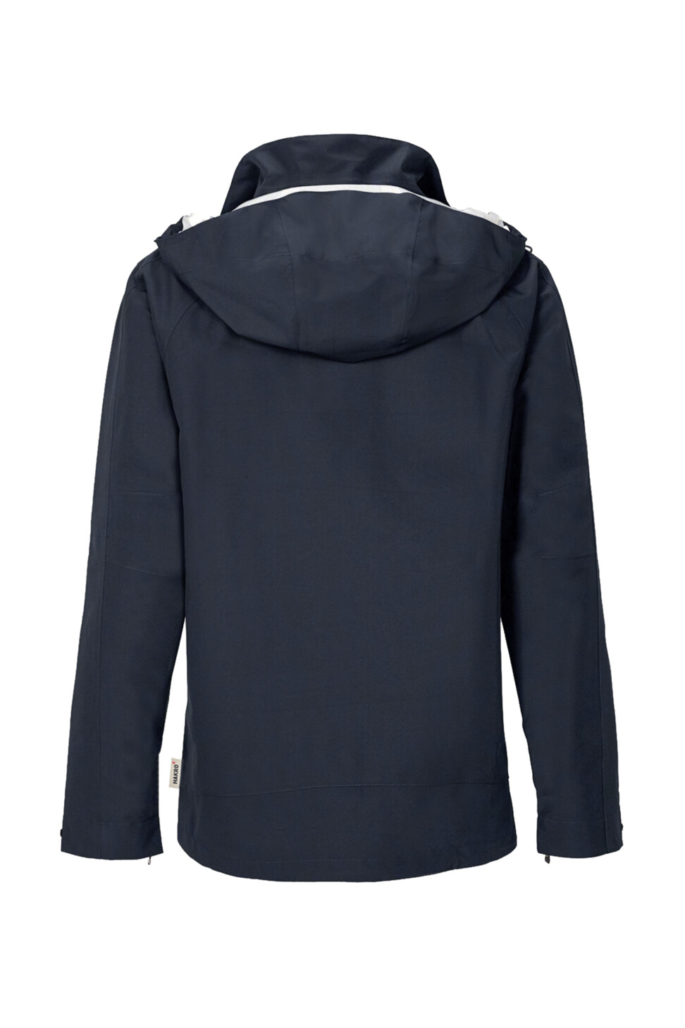 Kombijacke aus atmungsaktivem, wasser- und winddichtem Obermaterial mit getapten Nähten, abnehmbarer und regulierbarer Kapuze mit Schild, verlängertem, abgerundetem Rückenteil, hochwertigem Zwei-Wege-Frontreißverschluss mit Windstoppatte und Reißverschlussgarage, wasserdichten Reißverschlüssen an den Taschen und Reißverschlussärmeltasche. Alle Reißverschlüsse von YKK®. Weitenverstellbarer Saumabschluss mit Tunnelkordelzug und Stoppern, weitenverstellbare Ärmelbündchen mit Klettband zum stufenlosen Regulieren. Hergestellt aus strapazierfähigem wasser- und winddichtem Obermaterial aus 2,5-Lagen-Laminat mit TRIACTIVE PRO-Technologie für maximale und zuverlässige Wasser- und Winddichte. Gewebtes HAKRO Necklabel aus hochwertigem Kettsatin mit weichen, ultraschallgeschnittenen Bandkanten für höchsten Tragekomfort und gewebtes HAKRO Flaglabel an der linken Seitennaht.