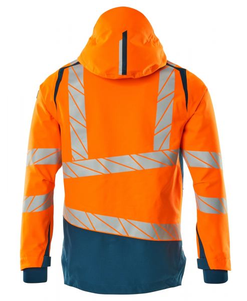 - Fluoreszierend und mit Reflexschulterstreifen sowie schräg verlaufenden Reflexen. Hoch strapazierfähiger, atmungsaktiver, wind- und wasserdichter Stoff. Nähte sind verklebt. Kapuze ist abnehmbar, gefüttert und mit verstellbaren Elastikschnüren versehen. Verschluss mit Reißverschluss und doppelter Wetterschutzleiste. Innentaschen - zwei mit Reißverschluss sowie eine offene aus Netzmaterial. ID-Kartenhalter ist abnehmbar. Brusttasche mit wasserdichtem Reißverschluss. Vordertaschen mit wasserdichten Reißverschlüssen. Stehkragen. Rippenbund an vorderen, unteren Innenseite des Saumes. Verlängerbarer Rücken durch Aufknöpfen zum besseren Schutz vor Wind und Wetter. Rippenbündchen (verdeckt unter der Wetterschutzleiste) an den Handgelenken. Klettverschluss an den Handgelenken. Mit Druckeffekten.
